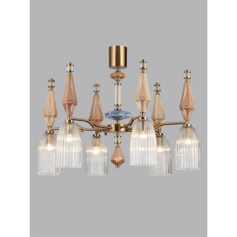 Преобладающий цвет плафонов: Прозрачный, арматуры: Разноцветный; материал изготовления арматуры: Металл, размеры, мм: / высота 2135 / диаметр 810. Общая мощность – 240 Ватт, а максимальная площадь освещения до 14 м2. Основной тип ламп, предусмотренный производителем: Накаливания с цоколем E14. В зависимости от предпочтений можно использовать лампы теплового, холодного или нейтрального света, за исключением люстр с типом цоколя LED.