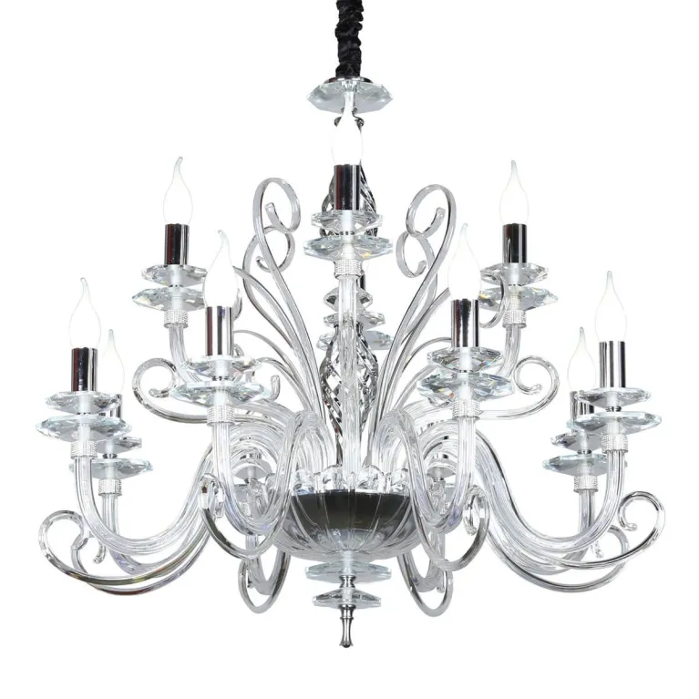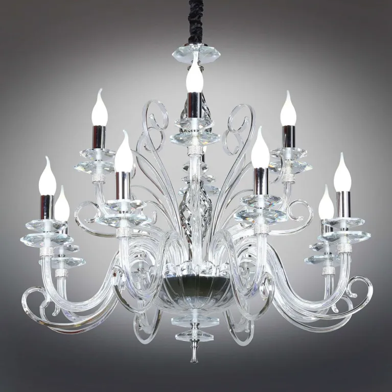 Люстра оснащена двенадцатью лампами, что обеспечивает яркое и равномерное освещение. Она совместима с лампами типа E14, что позволяет использовать как традиционные лампы накаливания, так и энергосберегающие или светодиодные, предоставляя вам возможность выбирать источник света по своему усмотрению.