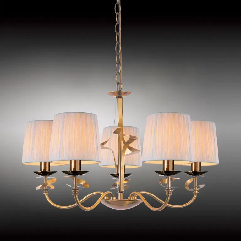 Люстра оснащена пятью источниками света с цоколем E14, что позволяет использовать различные типы ламп, включая энергосберегающие и светодиодные. Суммарная мощность ламп - 300 Вт, что обеспечивает яркое и равномерное освещение пространства. Основание выполнено из прочного металла, а плафоны - из качественного стекла, что гарантирует долговечность и надежность конструкции.