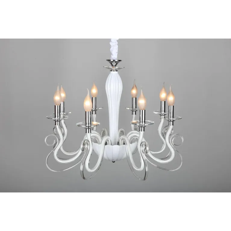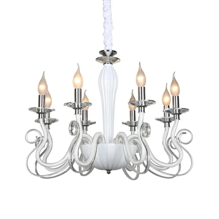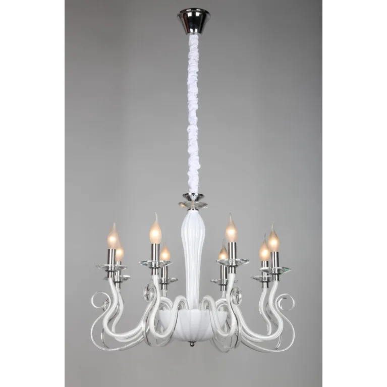 Этот светильник оснащен восемью патронами для ламп E14, что позволяет использовать как традиционные лампы накаливания, так и энергосберегающие или светодиодные лампы. Суммарная мощность ламп может составлять 320 Вт, что обеспечивает яркое и равномерное освещение пространства.