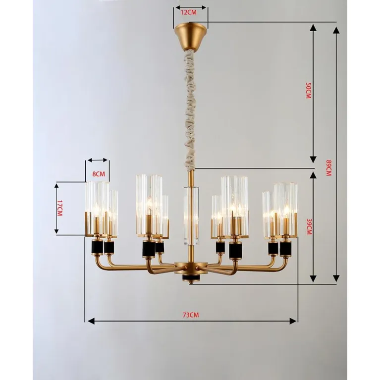 Люстра оснащена 8 лампами типа E14, что обеспечивает яркое и равномерное освещение. Она совместима с различными видами ламп, включая энергосберегающие и светодиодные, что позволяет выбрать оптимальный вариант в зависимости от ваших потребностей и предпочтений.