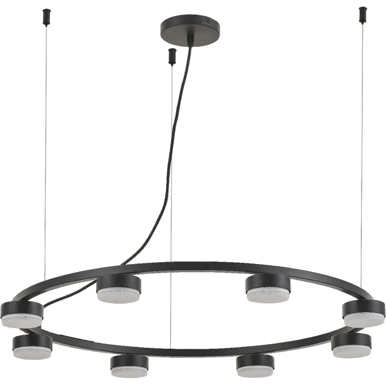 Преобладающий цвет плафонов: Черный, арматуры: Черный; материал изготовления арматуры: Металл, размеры, мм: / высота 1500 / диаметр 765. Общая мощность – 48 Ватт, а максимальная площадь освещения до 24 м2. Основной тип ламп, предусмотренный производителем: Светодиодная с цоколем GX53. В зависимости от предпочтений можно использовать лампы теплового, холодного или нейтрального света, за исключением люстр с типом цоколя LED.