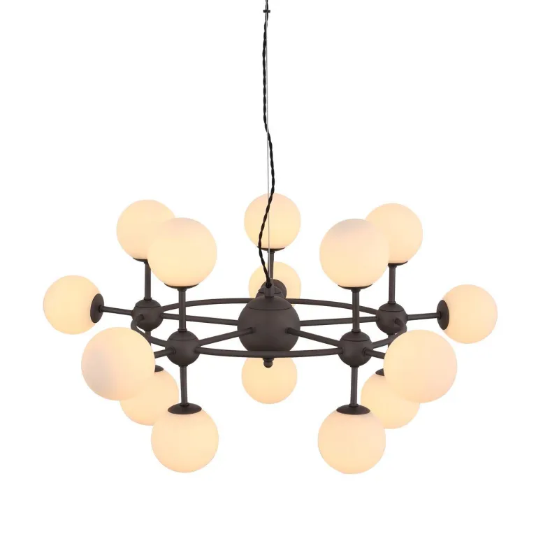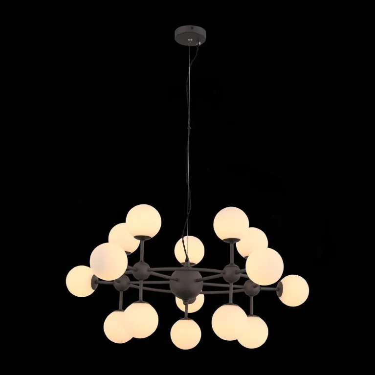 Корпус люстры выполнен из прочного металла с черным матовым покрытием, который прекрасно гармонирует с различными стилями оформления. Плафоны из белого матового стекла обеспечивают мягкое и равномерное рассеивание света, создавая уютную атмосферу в помещении.