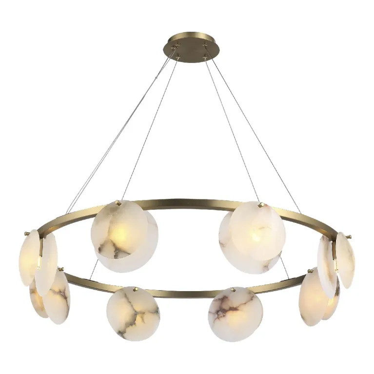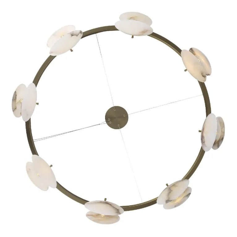 Преобладающий цвет плафонов: Белый, арматуры: Латунь; материал изготовления арматуры: Металл, размеры, мм: / высота 150 / диаметр 812. Общая мощность – 40 Ватт, а максимальная площадь освещения до 14 м2. Основной тип ламп, предусмотренный производителем: Светодиодная с цоколем G9. В зависимости от предпочтений можно использовать лампы теплового, холодного или нейтрального света, за исключением люстр с типом цоколя LED.