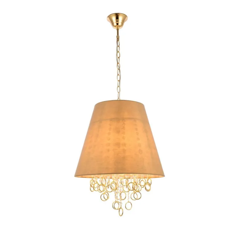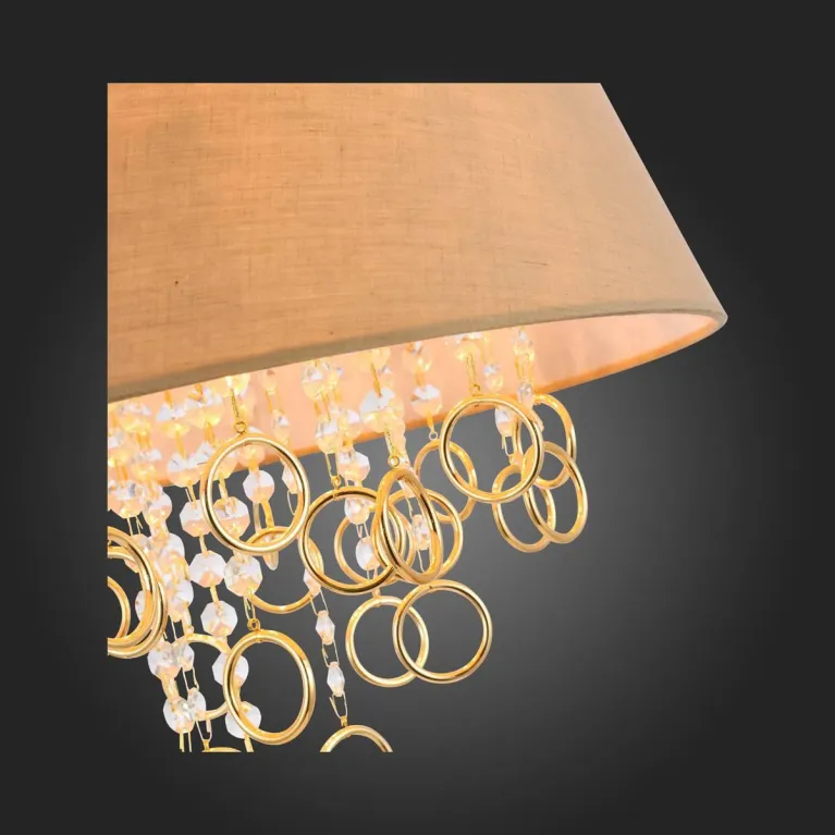 Корпус люстры выполнен из прочного металла и имеет стильное матовое золото покрытие, которое придает изделию роскошный и современный вид. Подвесная конструкция позволяет регулировать высоту люстры, что делает её удобной для помещений с высокими потолками.