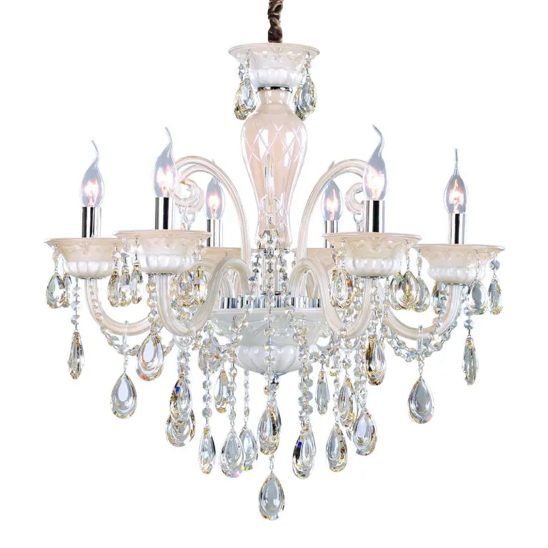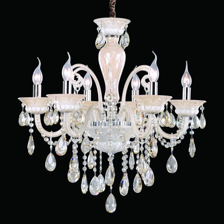 Люстра оснащена шестью лампами типа E14, что позволяет использовать как традиционные лампы накаливания, так и энергосберегающие или светодиодные лампы, обеспечивая максимальную гибкость в выборе источников света. Суммарная мощность ламп может составлять до 60 Вт, что обеспечивает яркое и равномерное освещение пространства.