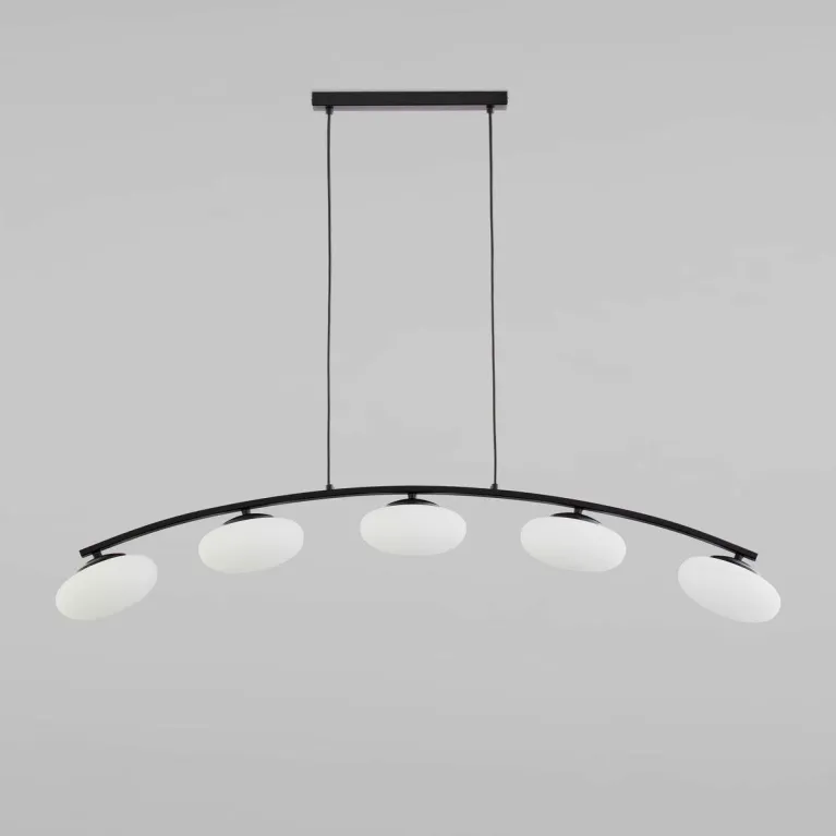 Корпус люстры выполнен из прочного металла с черным матовым покрытием, который прекрасно гармонирует с различными стилями интерьера. Плафоны из белого матового стекла обеспечивают мягкое и равномерное рассеивание света, создавая уютную атмосферу в комнате.