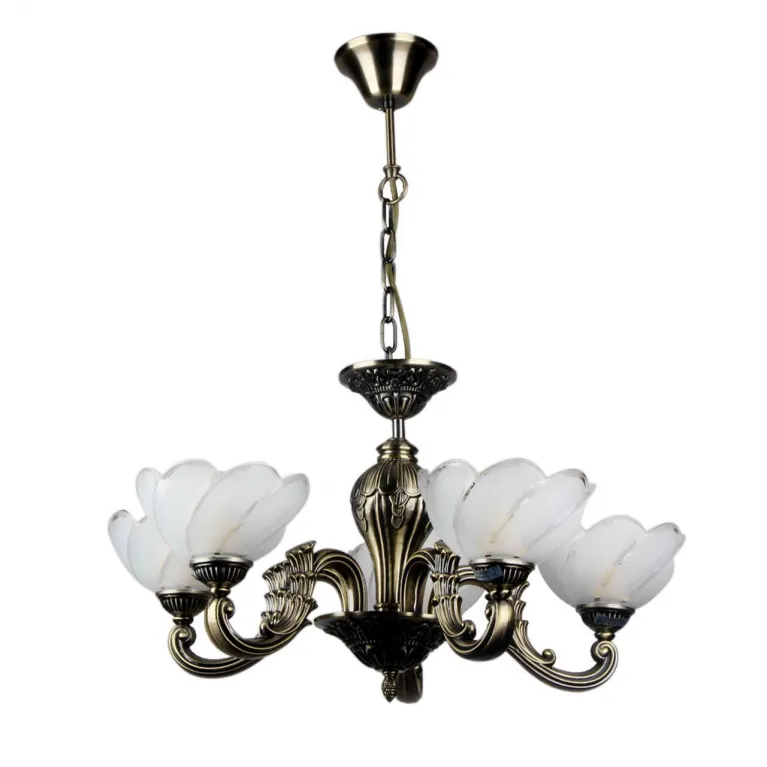Люстра оснащена пятью лампами, что обеспечивает яркое и равномерное освещение пространства. Она выполнена в классическом стиле, с основанием из прочного металла и белыми матовыми плафонами, которые придают ей современный вид и легкую изящности.