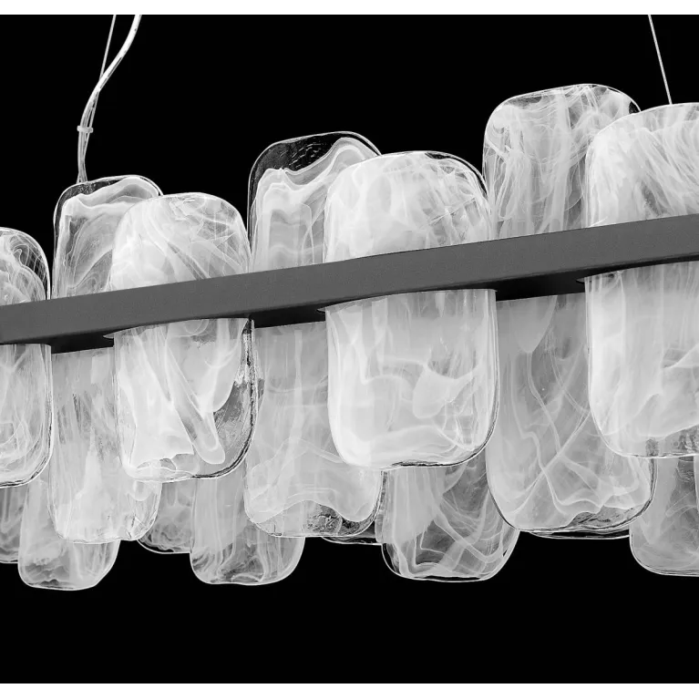 Преобладающий цвет плафонов: Прозрачный, арматуры: Черный; материал изготовления арматуры: Металл, размеры, мм: длина 990 / ширина 320 / высота 1500 Общая мощность – 125 Ватт, а максимальная площадь освещения до 38 м2. Основной тип ламп, предусмотренный производителем: Светодиодная с цоколем LED. В зависимости от предпочтений можно использовать лампы теплового, холодного или нейтрального света, за исключением люстр с типом цоколя LED.