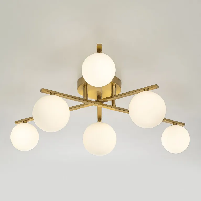 Преобладающий цвет плафонов: Белый, арматуры: Бронза; материал изготовления арматуры: Металл, размеры, мм: / высота 210 / диаметр 710. Общая мощность – 90 Ватт. Основной тип ламп, предусмотренный производителем: Светодиодная с цоколем G9. В зависимости от предпочтений можно использовать лампы теплового, холодного или нейтрального света, за исключением люстр с типом цоколя LED.