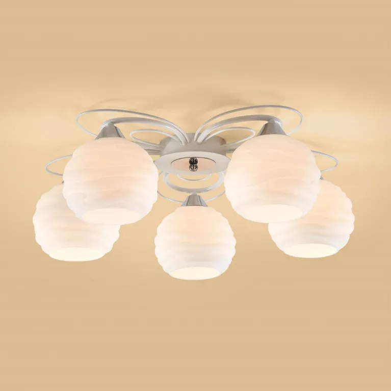 Люстра оснащена пятью лампами, которые обеспечивают яркое и равномерное освещение пространства. Она идеально подходит для помещений со стандартными потолками высотой до 2,7 м. Основание изготовлено из прочного металла, что гарантирует долговечность и надежность конструкции.