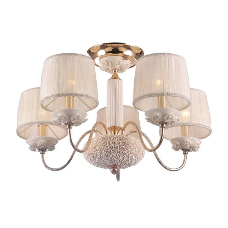 Люстра оснащена пятью источниками света с цоколем E14, что позволяет использовать различные типы ламп, включая энергосберегающие и светодиодные. Суммарная мощность ламп составляет 300 Вт, что обеспечивает яркое и равномерное освещение пространства.