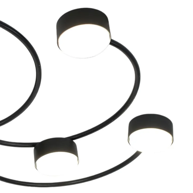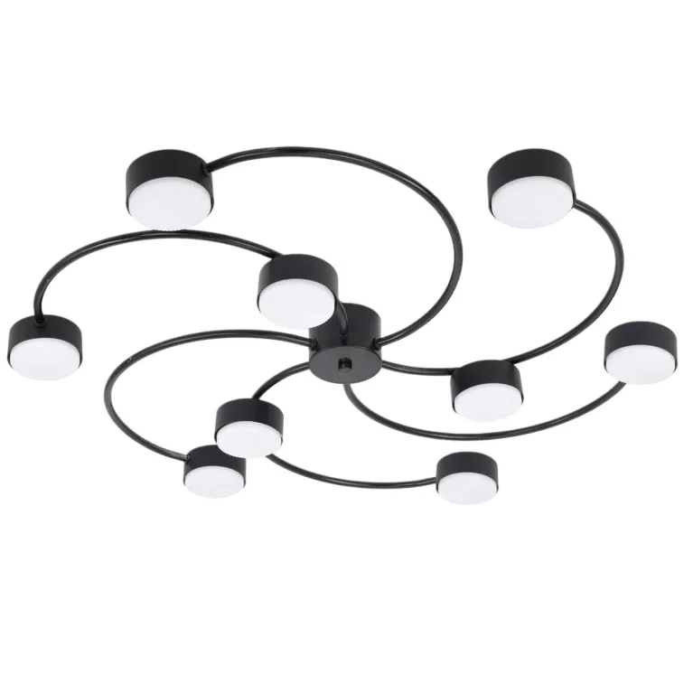 Преобладающий цвет плафонов: Черный, арматуры: Черный; материал изготовления арматуры: Металл, размеры, мм: / высота 85 / диаметр 720. Общая мощность – 135 Ватт, а максимальная площадь освещения до 27 м2. Основной тип ламп, предусмотренный производителем: Светодиодная с цоколем GX53. В зависимости от предпочтений можно использовать лампы теплового, холодного или нейтрального света, за исключением люстр с типом цоколя LED.