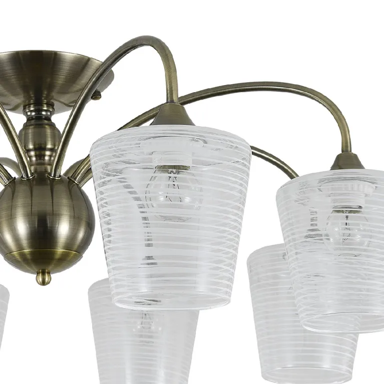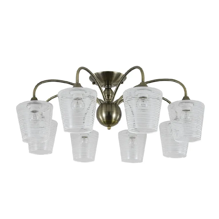 Преобладающий цвет плафонов: Прозрачный, арматуры: Бронза; материал изготовления арматуры: Металл, размеры, мм: / высота 280 / диаметр 740. Общая мощность – 320 Ватт, а максимальная площадь освещения до 20 м2. Основной тип ламп, предусмотренный производителем: Накаливания с цоколем E27. В зависимости от предпочтений можно использовать лампы теплового, холодного или нейтрального света, за исключением люстр с типом цоколя LED.