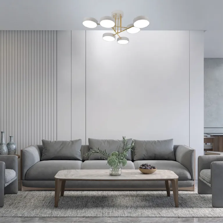 Преобладающий цвет плафонов: Белый, арматуры: Белый; материал изготовления арматуры: Металл, размеры, мм: длина 740 / ширина 740 / высота 260 Общая мощность – 78 Ватт, а максимальная площадь освещения до 18 м2. Основной тип ламп, предусмотренный производителем: Светодиодная с цоколем LED. В зависимости от предпочтений можно использовать лампы теплового, холодного или нейтрального света, за исключением люстр с типом цоколя LED.