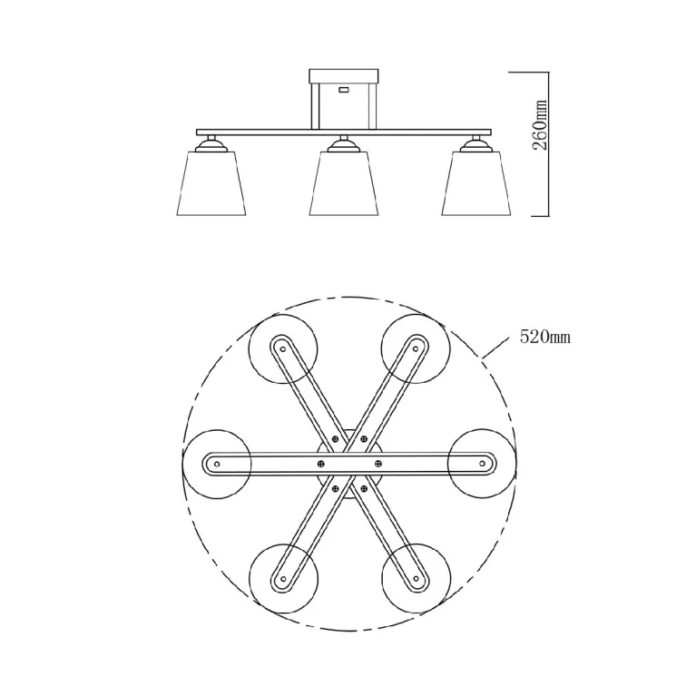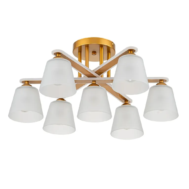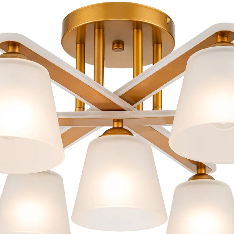 Преобладающий цвет плафонов: Белый, арматуры: Золото; материал изготовления арматуры: Металл, размеры, мм: / высота 260 / диаметр 520. Общая мощность – 420 Ватт, а максимальная площадь освещения до 21 м2. Основной тип ламп, предусмотренный производителем: Накаливания с цоколем E27. В зависимости от предпочтений можно использовать лампы теплового, холодного или нейтрального света, за исключением люстр с типом цоколя LED.