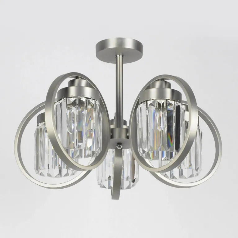 Люстра оснащена пятью лампами, что обеспечивает яркое и равномерное освещение пространства. Основание выполнено из прочного металла с сатиновым никелевым покрытием, которое придает изделию элегантный и современный вид. Плафоны изготовлены из прозрачного хрусталя, который искрится и переливается, создавая эффектное зрелище.