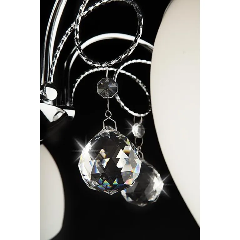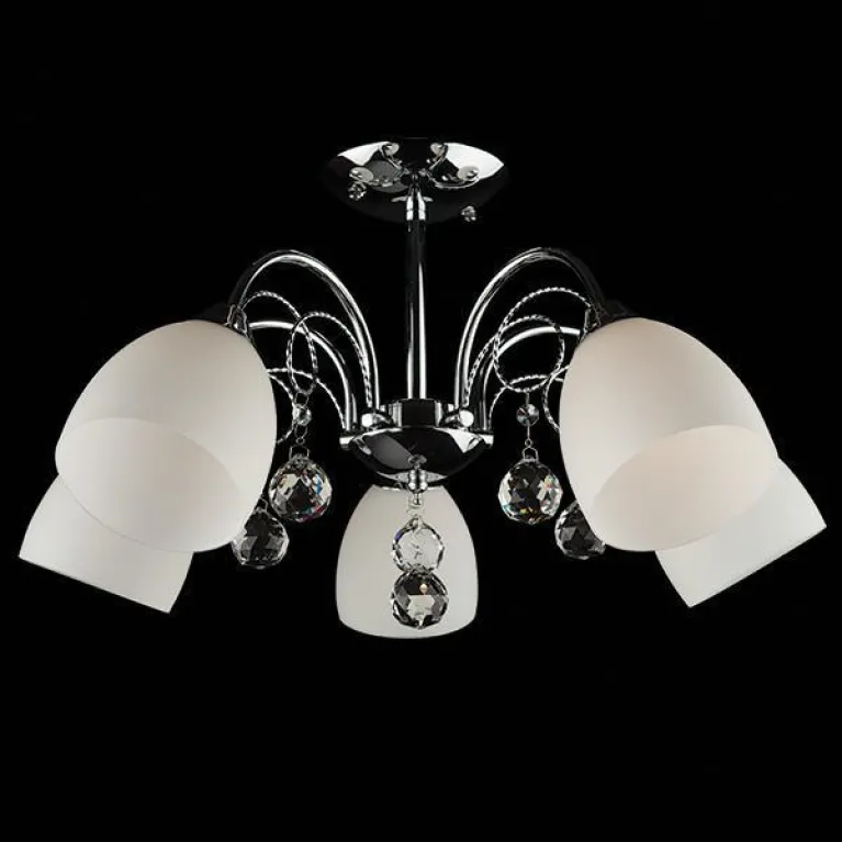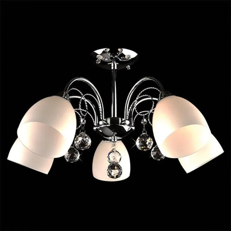 Люстра оснащена пятью лампами, что обеспечивает яркое и равномерное освещение пространства. Она изготовлена из прочного металла с хромированным покрытием, которое придает изделию современный и стильный вид. Плафоны выполнены из белого матового стекла, добавляющего лёгкости и изящества.