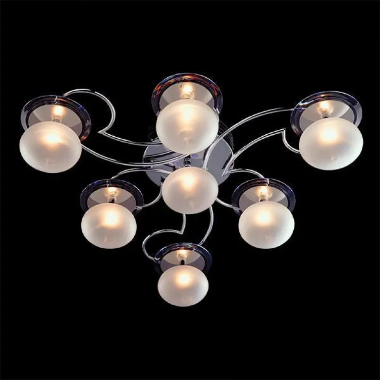Люстра оснащена семью источниками света с цоколем E14, что обеспечивает яркое и равномерное освещение. Возможность использования различных типов ламп (накаливания, энергосберегающие, светодиодные) позволяет адаптировать светильник под индивидуальные потребности и предпочтения.