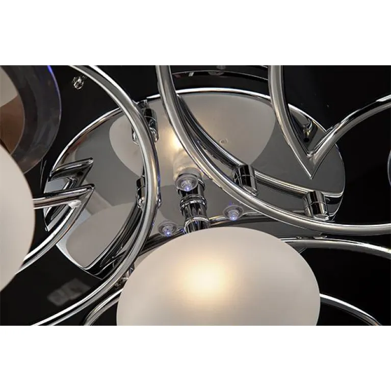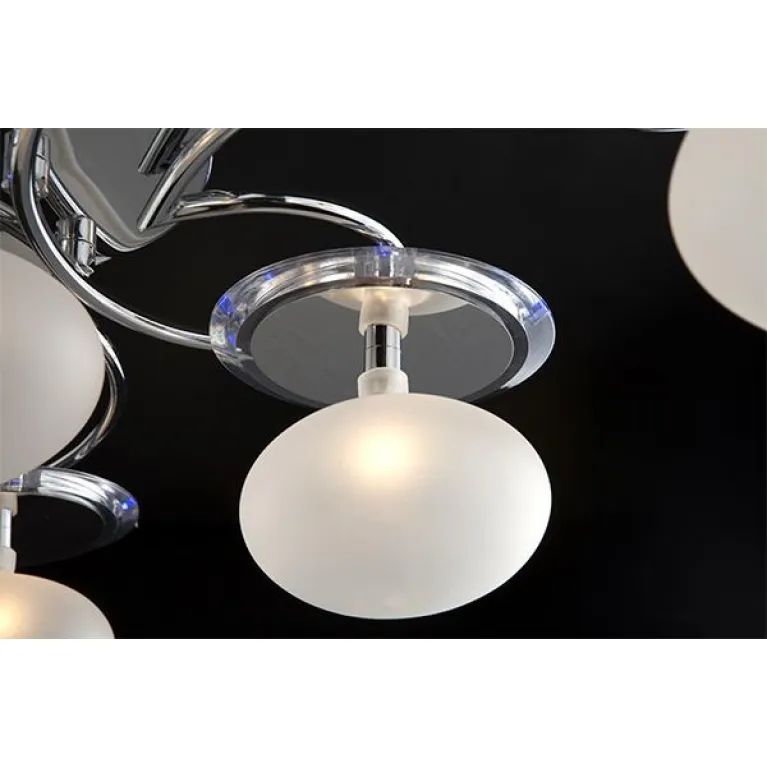 Корпус люстры выполнен из прочного металла с хромированным покрытием, который прекрасно гармонирует с различными стилями интерьера. Плафоны изготовлены из высококачественного стекла и представлены в синем, красном и фиолетовом цвете, что позволяет выбрать оптимальный вариант для вашего помещения.