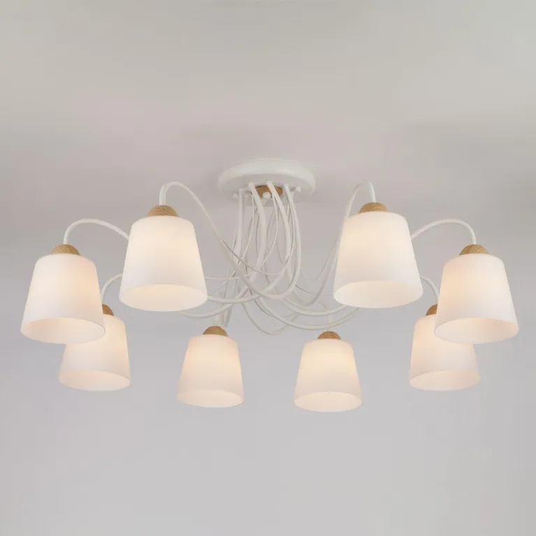 Преобладающий цвет плафонов: Белый, арматуры: Белый; материал изготовления арматуры: Металл, размеры, мм: / высота 350 / диаметр 870. Общая мощность – 400 Ватт, а максимальная площадь освещения до 16 м2. Основной тип ламп, предусмотренный производителем: Накаливания с цоколем E27. В зависимости от предпочтений можно использовать лампы теплового, холодного или нейтрального света, за исключением люстр с типом цоколя LED.