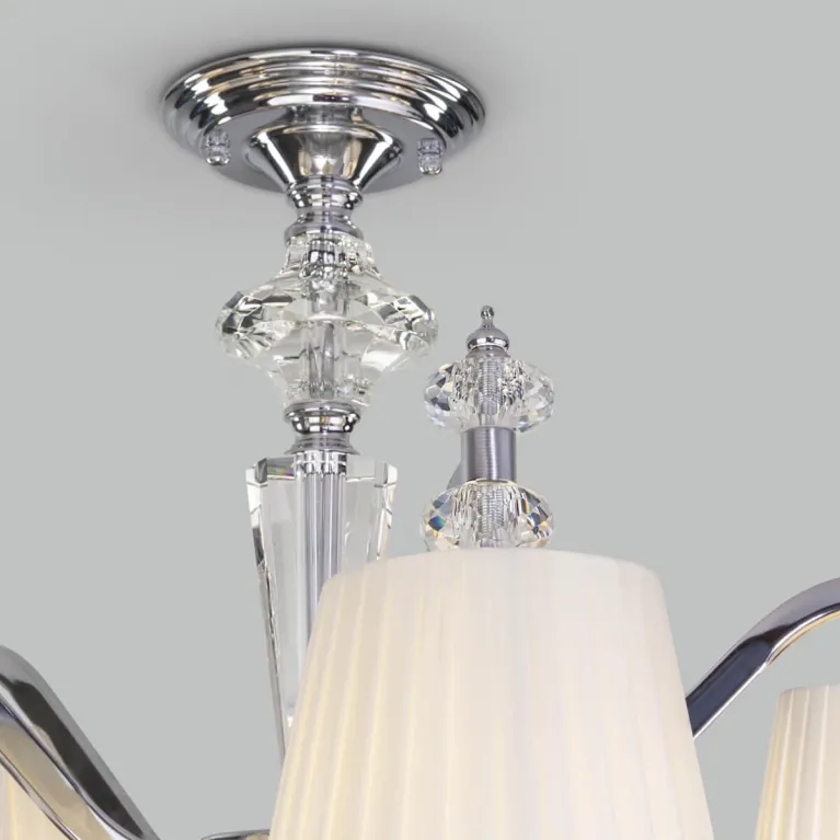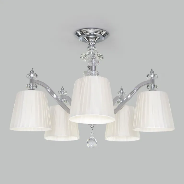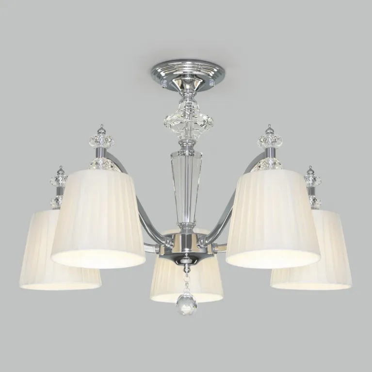 Люстра оснащена пятью лампами, что обеспечивает яркое и равномерное освещение пространства. Она изготовлена из прочного металла с хромированным покрытием, которое придает изделию современный и стильный вид.