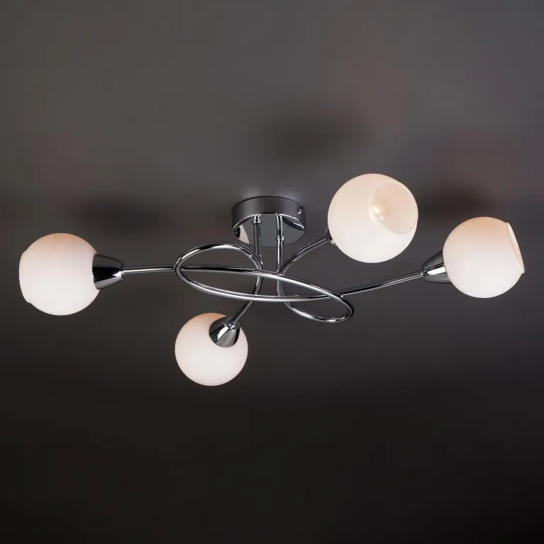 Люстра оснащена четырьмя лампами, что обеспечивает яркое и равномерное освещение. Она изготовлена из прочного металла с хромированным покрытием, которое придаёт изделию современный и стильный вид. Плафоны выполнены из качественного белого матового стекла, обеспечивающего мягкое и приятное рассеивание света.