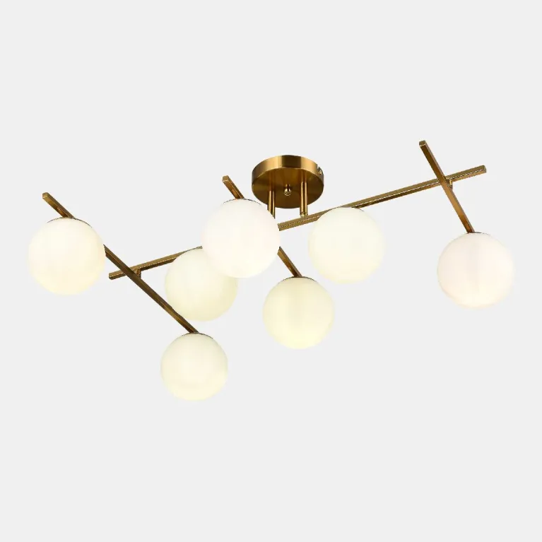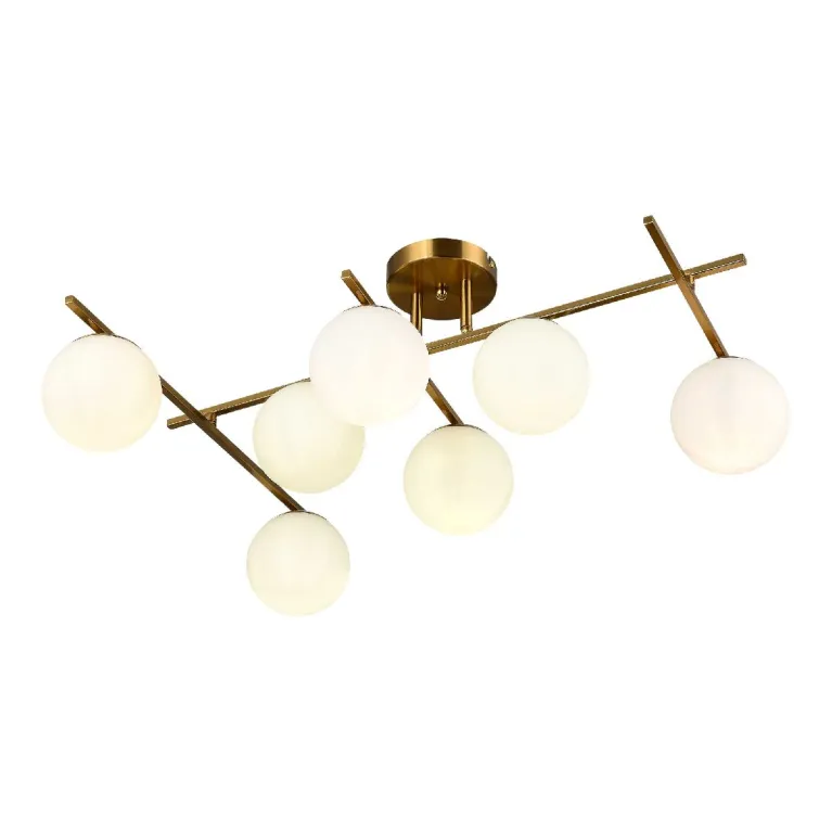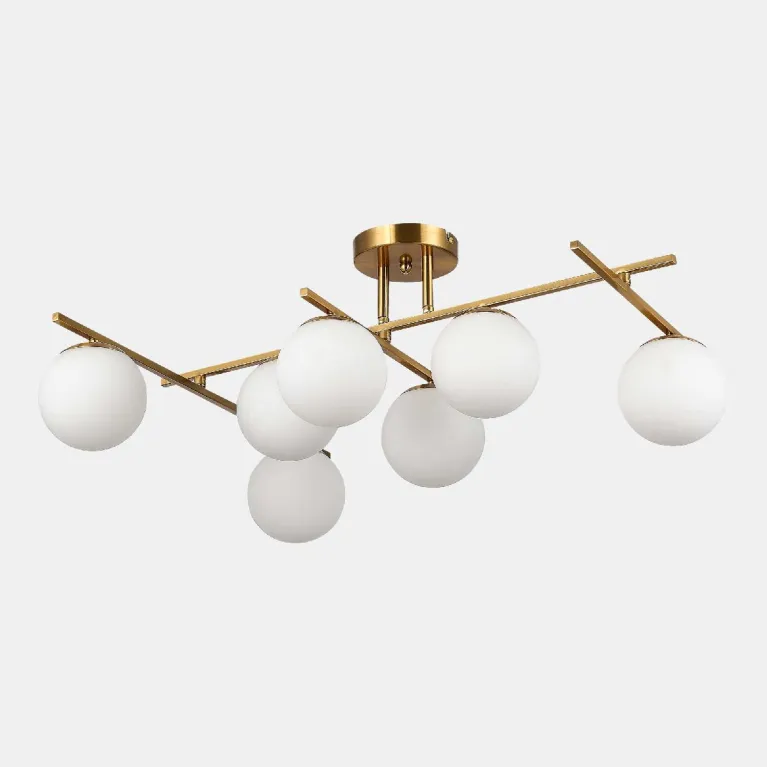 Преобладающий цвет плафонов: Белый, арматуры: Латунь; материал изготовления арматуры: Металл, размеры, мм: длина 720 / ширина 520 / высота 260 Общая мощность – 280 Ватт, а максимальная площадь освещения до 14 м2. Основной тип ламп, предусмотренный производителем: Накаливания с цоколем E14. В зависимости от предпочтений можно использовать лампы теплового, холодного или нейтрального света, за исключением люстр с типом цоколя LED.