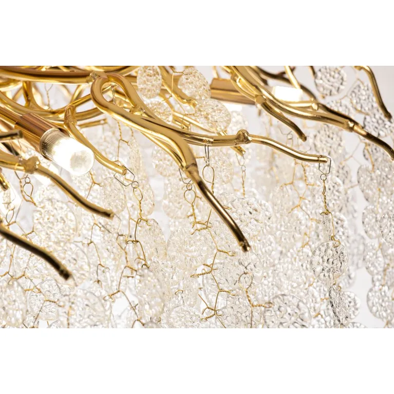 Преобладающий цвет плафонов: Прозрачный, арматуры: Золото; материал изготовления арматуры: Металл, размеры, мм: / высота 400 / диаметр 1000. Общая мощность – 520 Ватт, а максимальная площадь освещения до 30 м2. Основной тип ламп, предусмотренный производителем: Галогеновая с цоколем G9. В зависимости от предпочтений можно использовать лампы теплового, холодного или нейтрального света, за исключением люстр с типом цоколя LED.