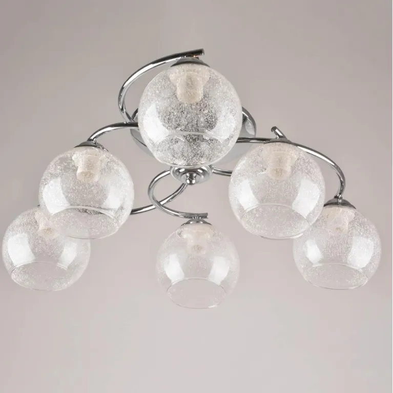 Люстра оснащена шестью лампами, что обеспечивает яркое и равномерное освещение пространства. Она изготовлена из прочного металла и качественного пластика, благодаря чему долговечна и надёжна в использовании. Плафоны выполнены в элегантном белом цвете, который прекрасно гармонирует с различными стилями интерьера.