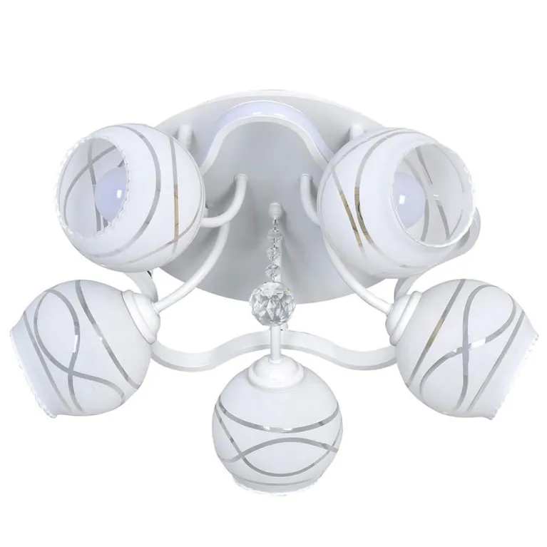 Люстра оснащена пятью источниками света с цоколем E27, что позволяет использовать различные типы ламп, включая энергосберегающие и светодиодные. Суммарная мощность ламп — 60 Вт, что обеспечивает достаточное освещение пространства площадью до 30 квадратных метров.