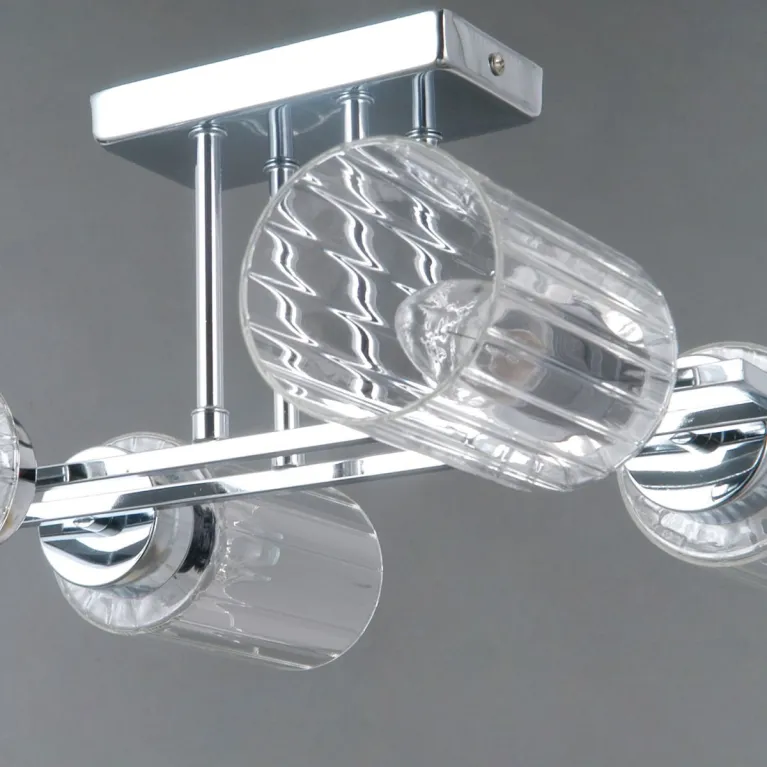 Преобладающий цвет плафонов: Прозрачный, арматуры: Хром; материал изготовления арматуры: Металл, размеры, мм: длина 330 / ширина 390 / высота 170 Общая мощность – 160 Ватт, а максимальная площадь освещения до 24 м2. Основной тип ламп, предусмотренный производителем: Накаливания с цоколем E14. В зависимости от предпочтений можно использовать лампы теплового, холодного или нейтрального света, за исключением люстр с типом цоколя LED.