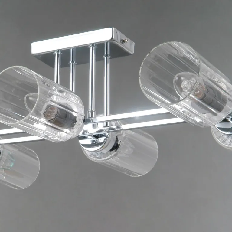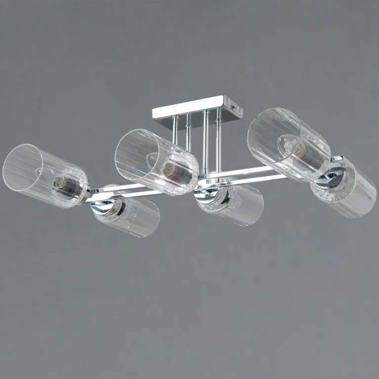 Преобладающий цвет плафонов: Прозрачный, арматуры: Хром; материал изготовления арматуры: Металл, размеры, мм: длина 530 / ширина 390 / высота 170 Общая мощность – 240 Ватт, а максимальная площадь освещения до 36 м2. Основной тип ламп, предусмотренный производителем: Накаливания с цоколем E14. В зависимости от предпочтений можно использовать лампы теплового, холодного или нейтрального света, за исключением люстр с типом цоколя LED.