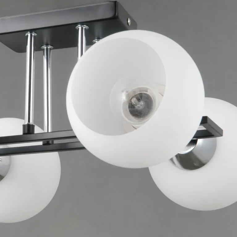 Преобладающий цвет плафонов: Белый, арматуры: Черный; материал изготовления арматуры: Металл, размеры, мм: длина 390 / ширина 320 / высота 200 Общая мощность – 160 Ватт, а максимальная площадь освещения до 24 м2. Основной тип ламп, предусмотренный производителем: Накаливания с цоколем E27. В зависимости от предпочтений можно использовать лампы теплового, холодного или нейтрального света, за исключением люстр с типом цоколя LED.