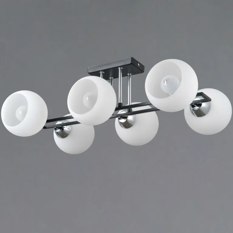 Преобладающий цвет плафонов: Белый, арматуры: Черный; материал изготовления арматуры: Металл, размеры, мм: длина 600 / ширина 320 / высота 200 Общая мощность – 240 Ватт, а максимальная площадь освещения до 36 м2. Основной тип ламп, предусмотренный производителем: Накаливания с цоколем E27. В зависимости от предпочтений можно использовать лампы теплового, холодного или нейтрального света, за исключением люстр с типом цоколя LED.