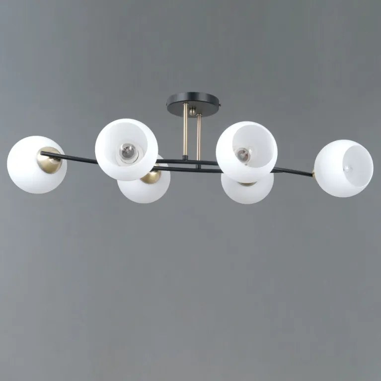 Преобладающий цвет плафонов: Белый, арматуры: Черный; материал изготовления арматуры: Металл, размеры, мм: длина 750 / ширина 350 / высота 220 Общая мощность – 240 Ватт, а максимальная площадь освещения до 36 м2. Основной тип ламп, предусмотренный производителем: Накаливания с цоколем E14. В зависимости от предпочтений можно использовать лампы теплового, холодного или нейтрального света, за исключением люстр с типом цоколя LED.