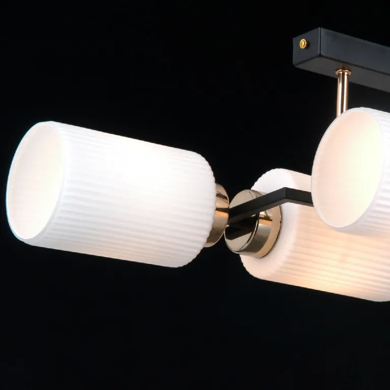 Преобладающий цвет плафонов: Белый, арматуры: Черный; материал изготовления арматуры: Металл, размеры, мм: длина 540 / ширина 270 / высота 200 Общая мощность – 160 Ватт, а максимальная площадь освещения до 24 м2. Основной тип ламп, предусмотренный производителем: Накаливания с цоколем E27. В зависимости от предпочтений можно использовать лампы теплового, холодного или нейтрального света, за исключением люстр с типом цоколя LED.