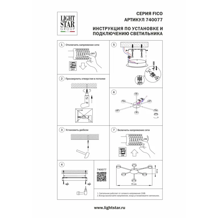 Артикул 740077 отвечает всем современным требованиям и стандартам качества, продукция сертифицирована. ✔ Гарантия от производителя. Цена люстры Lightstar Fico 740077 до 5 499 ₽(в магазине «Иллюзия Света» регулярно проходят скидки и акции, следите за обновлениями). Сведения о технических характеристиках, габаритах, внешнем виде и комплектации носят справочный характер, при возникновении вопросов обращайтесь к нашим менеджерам по телефонам ☎ +7(495)489-84-89 ☎ +7(800)707-70-34 или отправьте нам сообщение онлайн с помощью чата в углу экрана.