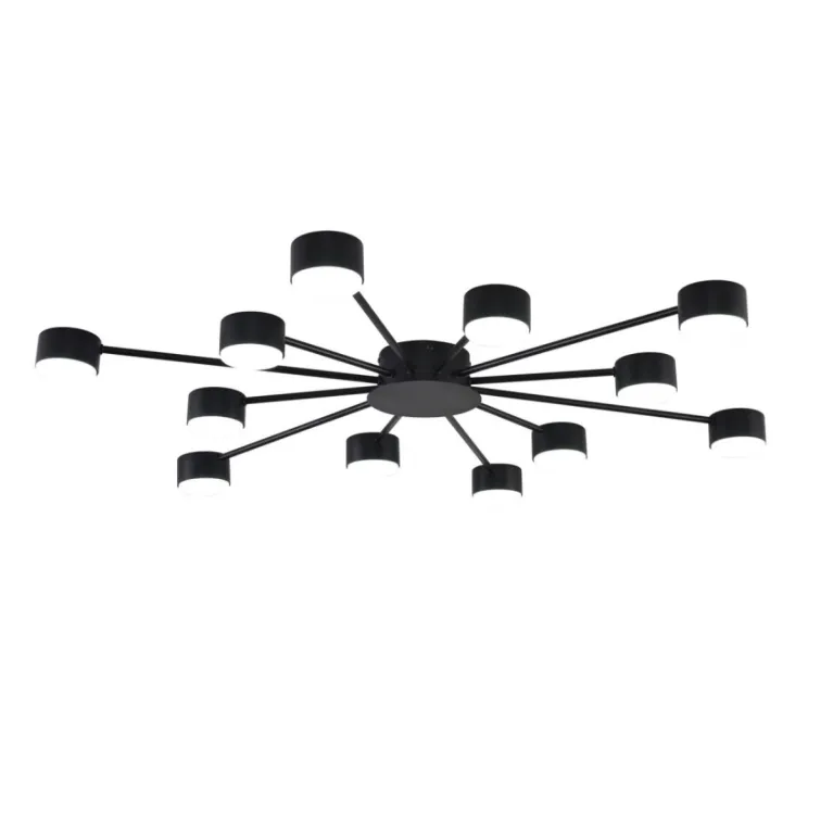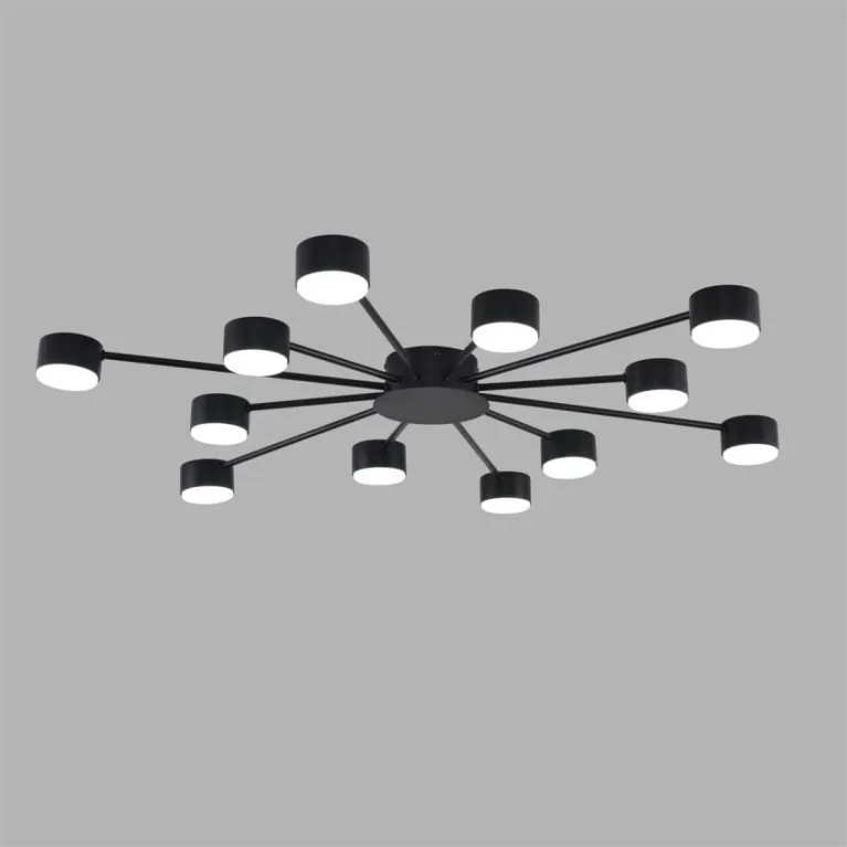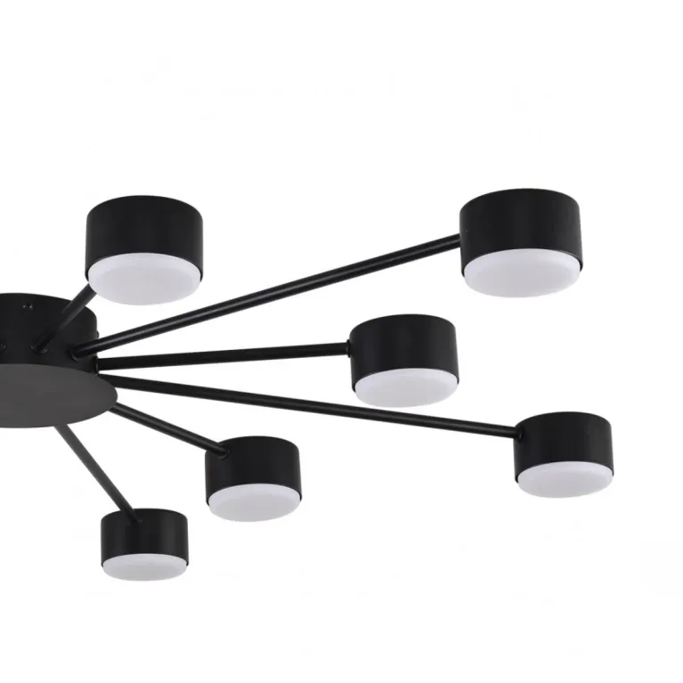 Преобладающий цвет плафонов: Черный, арматуры: Черный; материал изготовления арматуры: Металл, размеры, мм: / высота 73 / диаметр 1000. Общая мощность – 84 Ватт, а максимальная площадь освещения до 16 м2. Основной тип ламп, предусмотренный производителем: Светодиодная с цоколем GX53. В зависимости от предпочтений можно использовать лампы теплового, холодного или нейтрального света, за исключением люстр с типом цоколя LED.