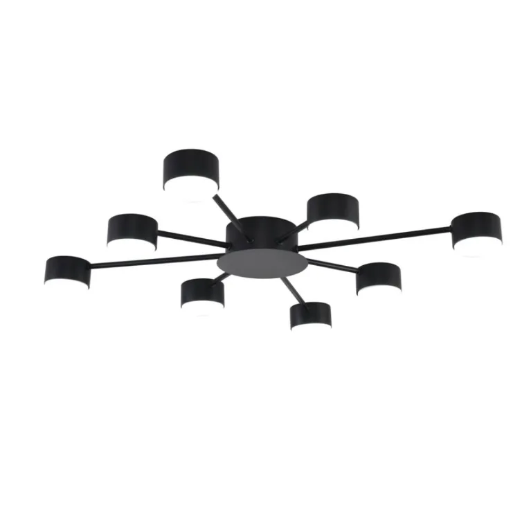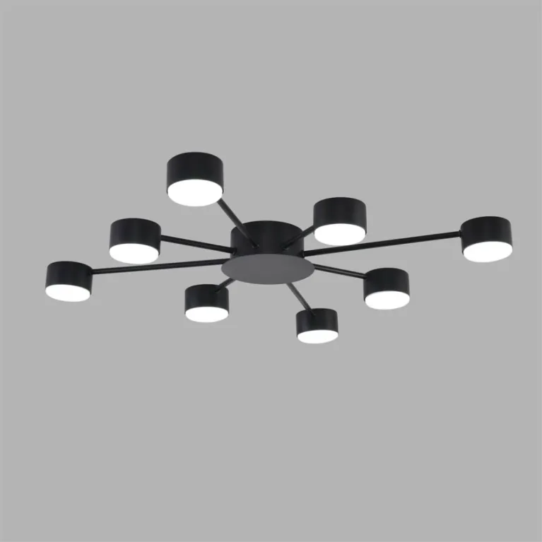 Преобладающий цвет плафонов: Черный, арматуры: Черный; материал изготовления арматуры: Металл, размеры, мм: / высота 73 / диаметр 780. Общая мощность – 56 Ватт, а максимальная площадь освещения до 11 м2. Основной тип ламп, предусмотренный производителем: Светодиодная с цоколем GX53. В зависимости от предпочтений можно использовать лампы теплового, холодного или нейтрального света, за исключением люстр с типом цоколя LED.