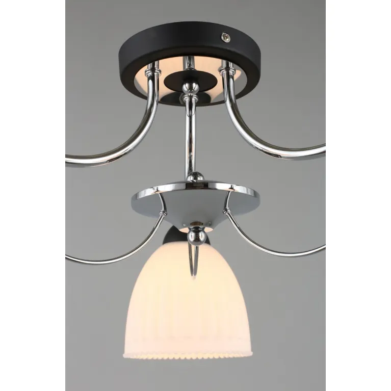 Корпус люстры выполнен из прочного металла с черным матовым покрытием, который прекрасно гармонирует с различными стилями интерьера. Плафоны изготовлены из качественного пластика, что гарантирует долговечность и простоту в уходе.