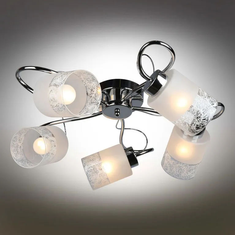 Этот светильник оснащен пятью источниками света с цоколем E14, что позволяет использовать различные типы ламп, включая энергосберегающие и светодиодные. Суммарная мощность ламп - 300 Вт, что обеспечивает яркое и равномерное освещение пространства.