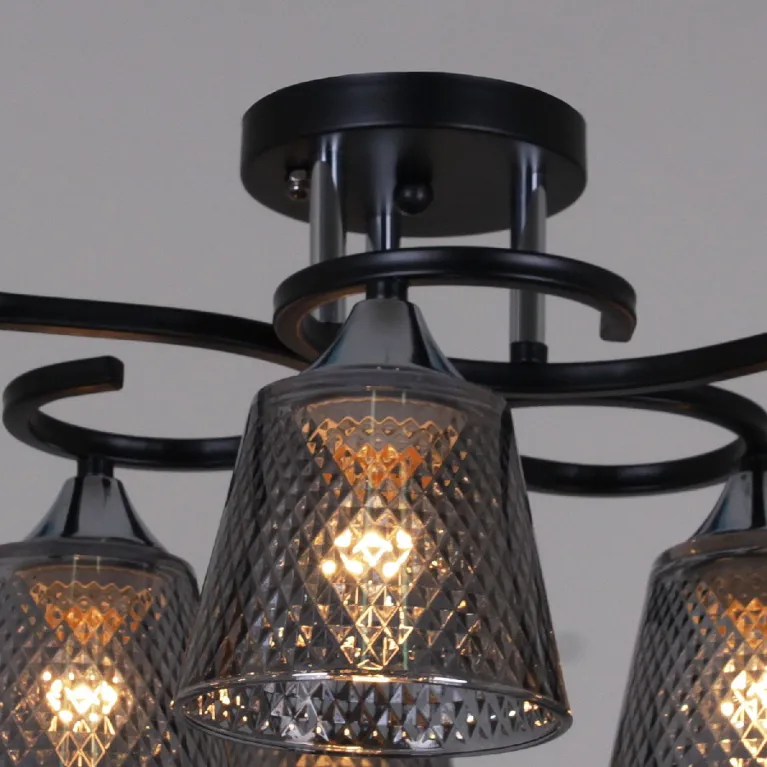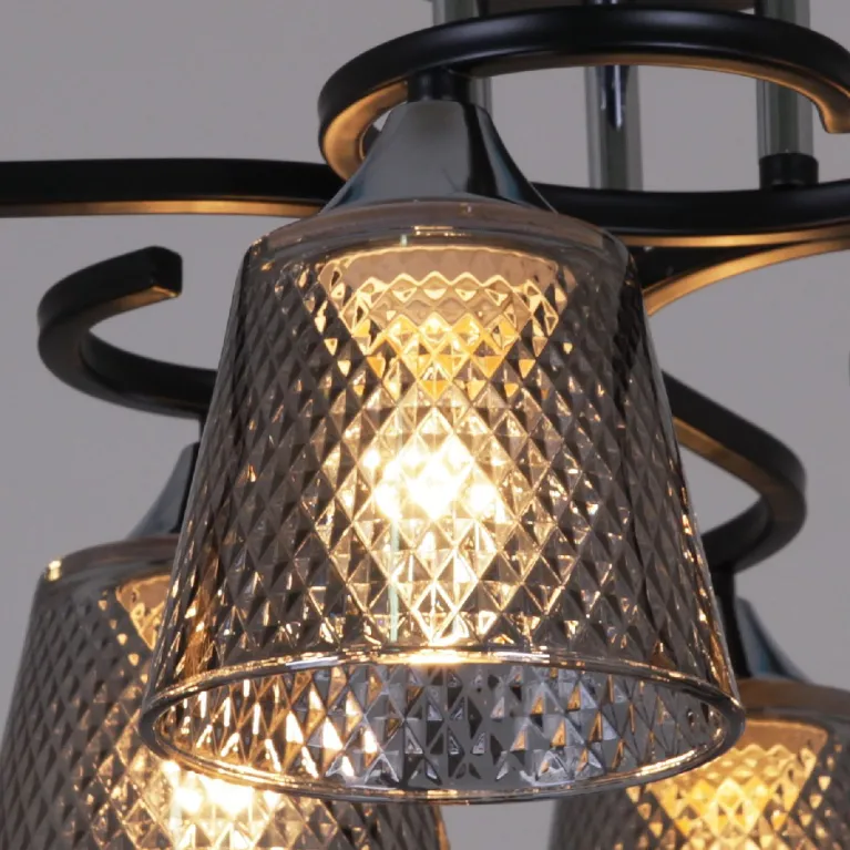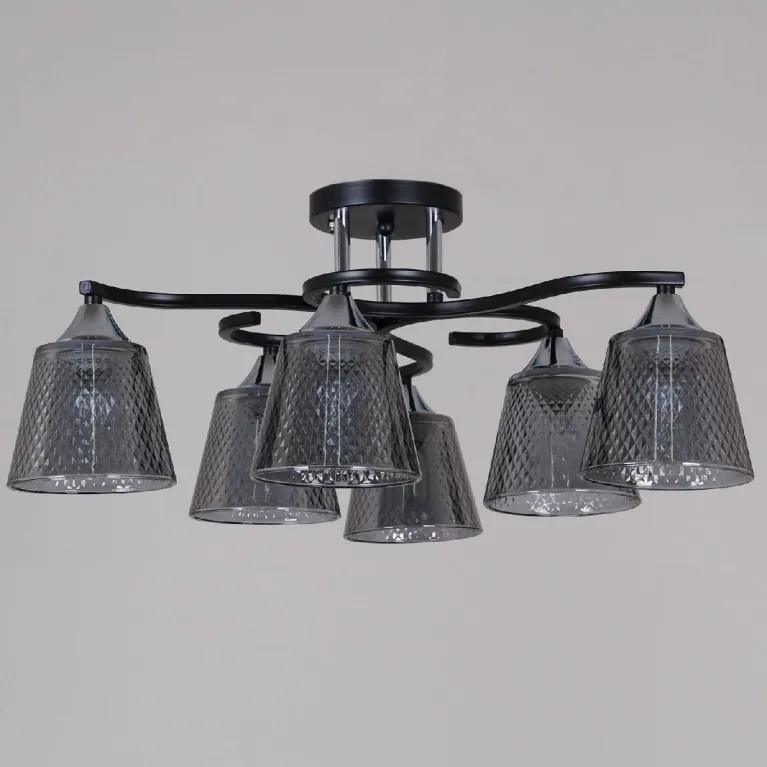 Преобладающий цвет плафонов: Дымчатый, арматуры: Черный; материал изготовления арматуры: Металл, размеры, мм: / высота 230 / диаметр 525. Общая мощность – 240 Ватт, а максимальная площадь освещения до 36 м2. Основной тип ламп, предусмотренный производителем: Накаливания с цоколем E27. В зависимости от предпочтений можно использовать лампы теплового, холодного или нейтрального света, за исключением люстр с типом цоколя LED.