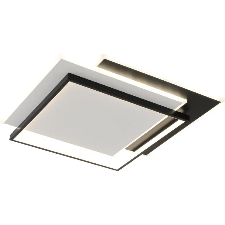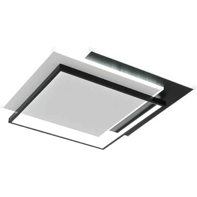 Преобладающий цвет плафонов: Белый, арматуры: Черный; материал изготовления арматуры: Металл, размеры, мм: длина 500 / ширина 500 / высота 65 Общая мощность – 146 Ватт, а максимальная площадь освещения до 35 м2. Основной тип ламп, предусмотренный производителем: Светодиодная с цоколем LED. В зависимости от предпочтений можно использовать лампы теплового, холодного или нейтрального света, за исключением люстр с типом цоколя LED.