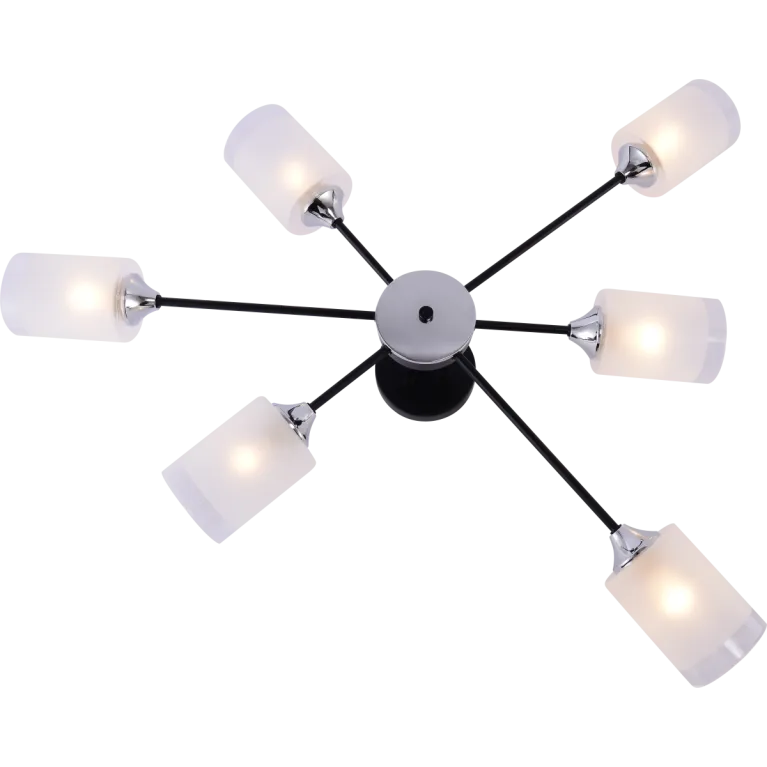 Преобладающий цвет плафонов: Белый, арматуры: Черный; материал изготовления арматуры: Металл, размеры, мм: длина 650 / ширина 750 / высота 200 Общая мощность – 360 Ватт, а максимальная площадь освещения до 18 м2. Основной тип ламп, предусмотренный производителем: Накаливания с цоколем E27. В зависимости от предпочтений можно использовать лампы теплового, холодного или нейтрального света, за исключением люстр с типом цоколя LED.