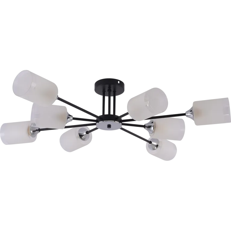 Преобладающий цвет плафонов: Белый, арматуры: Черный; материал изготовления арматуры: Металл, размеры, мм: длина 600 / ширина 780 / высота 200 Общая мощность – 480 Ватт, а максимальная площадь освещения до 24 м2. Основной тип ламп, предусмотренный производителем: Накаливания с цоколем E27. В зависимости от предпочтений можно использовать лампы теплового, холодного или нейтрального света, за исключением люстр с типом цоколя LED.