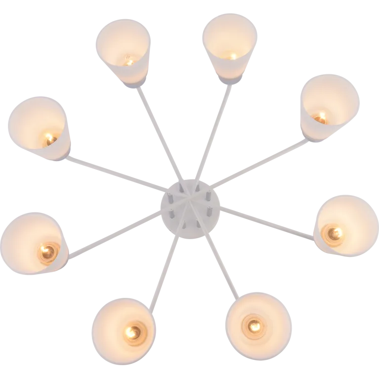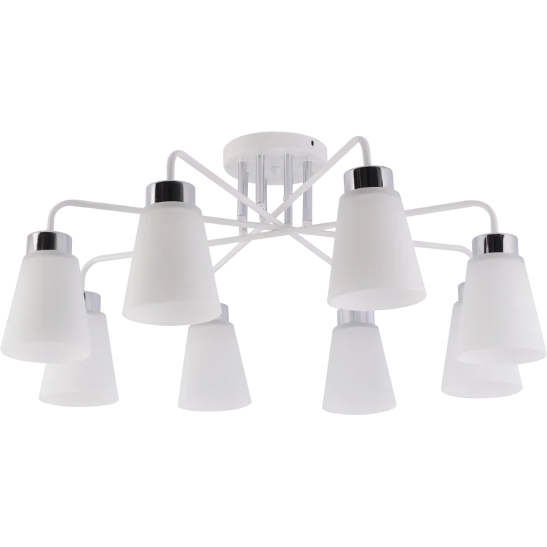 Преобладающий цвет плафонов: Белый, арматуры: Белый; материал изготовления арматуры: Металл, размеры, мм: / высота 340 / диаметр 760. Общая мощность – 480 Ватт, а максимальная площадь освещения до 24 м2. Основной тип ламп, предусмотренный производителем: Накаливания с цоколем E27. В зависимости от предпочтений можно использовать лампы теплового, холодного или нейтрального света, за исключением люстр с типом цоколя LED.
