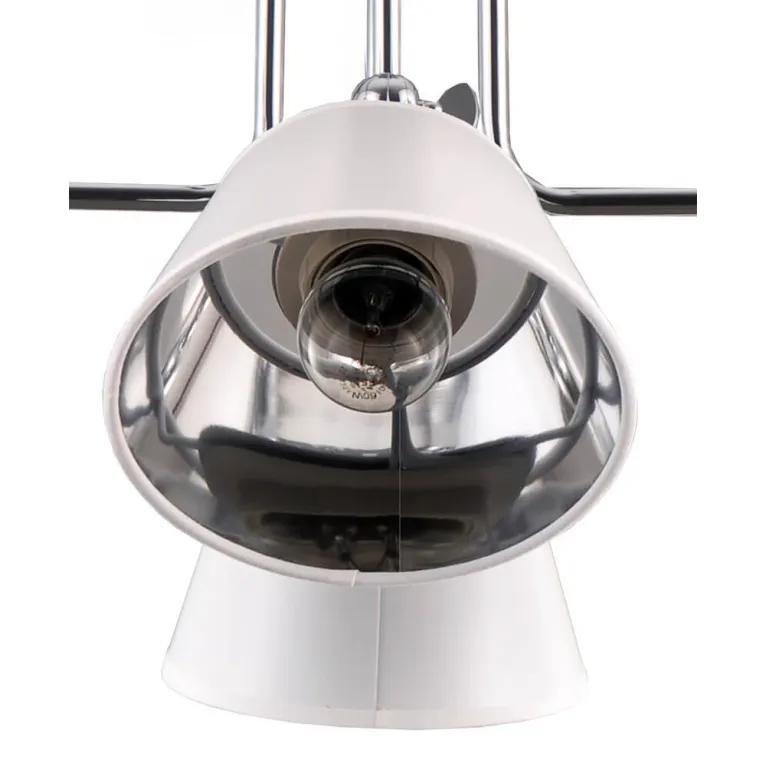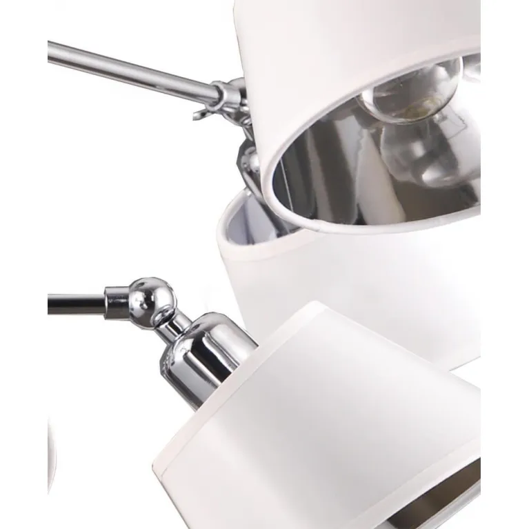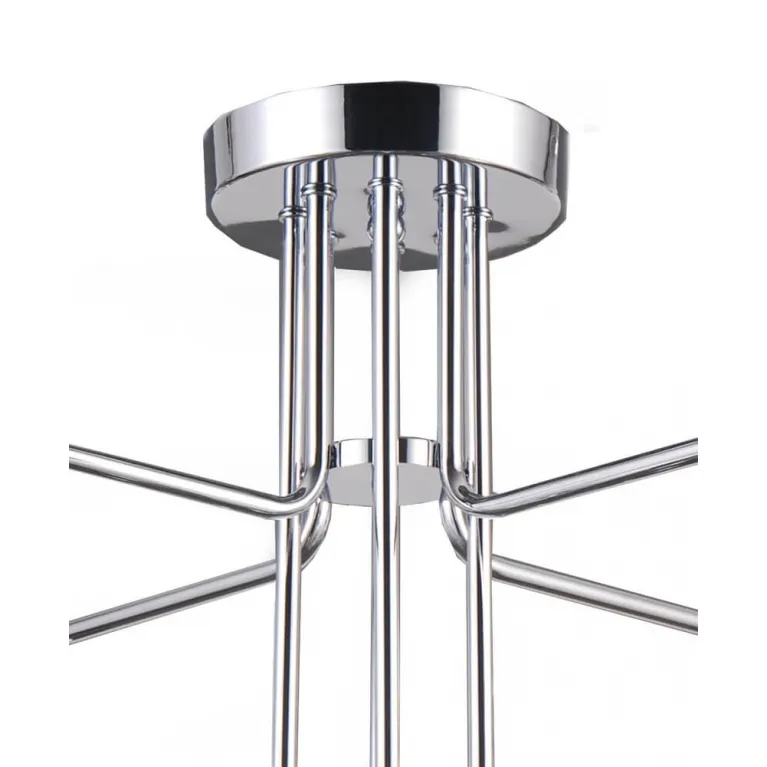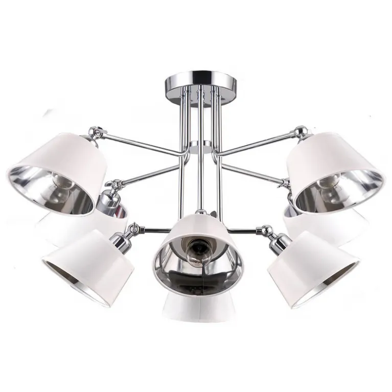 Люстра оснащена семью лампами, которые обеспечивают яркое и равномерное освещение. Она выполнена в современном дизайне и сочетает в себе хромированные элементы и белые матовые плафоны, что придает ей утонченный и стильный вид.