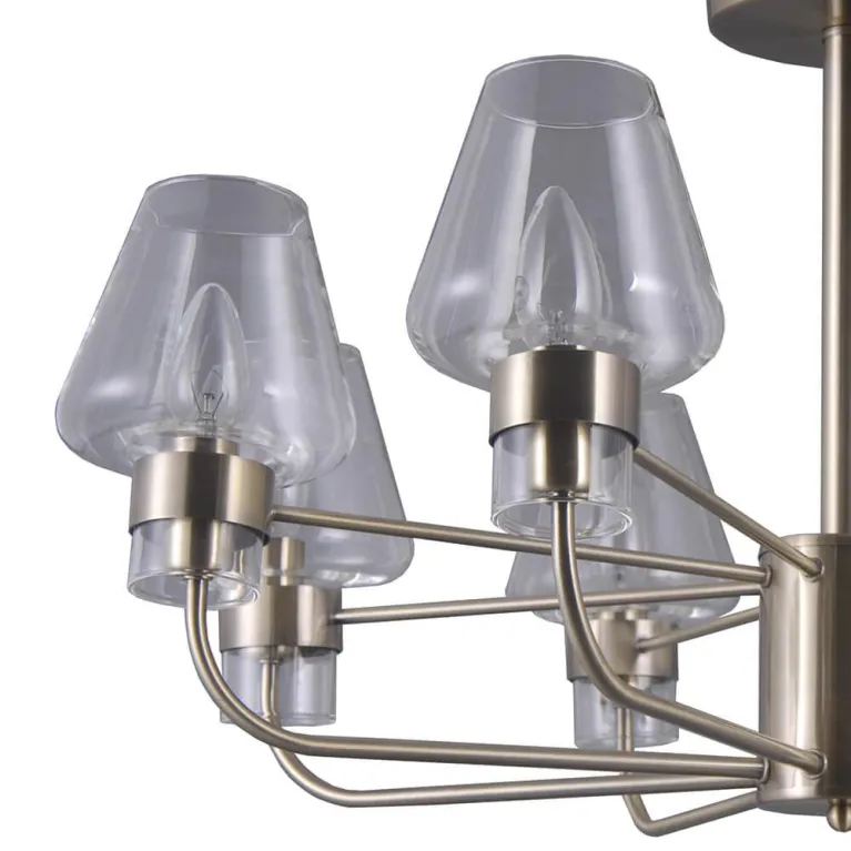 Люстра оснащена пятью лампами типа E14, что обеспечивает яркое и равномерное освещение. Она прекрасно дополнит любой интерьер, добавив ему уюта и утонченности. Основание выполнено из прочного металла, что гарантирует долговечность и надежность изделия.