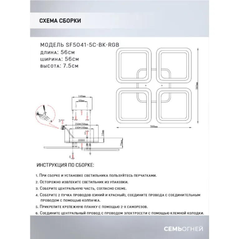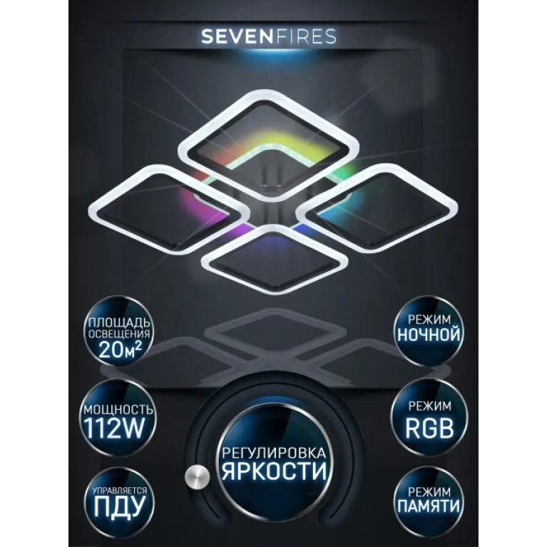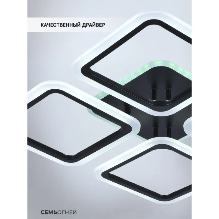 Преобладающий цвет плафонов: Черный, арматуры: Черный; материал изготовления арматуры: Металл, размеры, мм: длина 560 / ширина 560 / высота 75 Общая мощность – 112 Ватт, а максимальная площадь освещения до 20 м2. Основной тип ламп, предусмотренный производителем: Светодиодная с цоколем LED. В зависимости от предпочтений можно использовать лампы теплового, холодного или нейтрального света, за исключением люстр с типом цоколя LED.